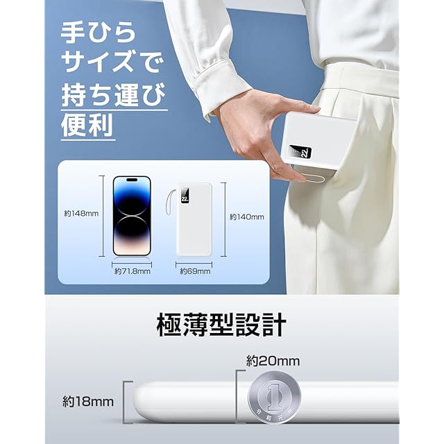【LED残量表示・薄型軽量デザイン】 モバイルバッテリー LED残量表示機能により、バッテリーの残量を一目で確認できます。さらに、厚さ約18mmの超薄型設計で、手のひらサイズのため持ち運びが非常に便利です。コンパクトなデザインで、荷物をスッキリ整理できます。