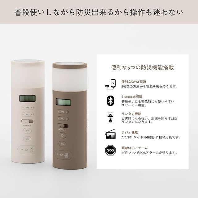 【スピーカー】φ36mm、実用最大出力340mW【LEDランタン光源】電球色、昼光色【LED明るさ】電球色:約15lm、昼光色:約16lm【SOSアラーム音量】約81dB【IN 入力端子】USB Type-C(モバイルバッテリー、ACアダプター用)【OUT 出力端子】USB Type-A(スマートフォン充電用)