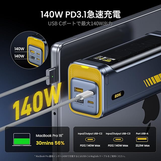 【PD3.1と140W急速充電】 Power Delivery(PD)3.1テクノロジーを搭載し、迅速かつ安全な充電を実現します。お使いのデバイスに迅速かつ最適な充電を提供します。140Wの超高出力は、ほぼすべての市場で利用されているデバイスと互換性があります。さまざまなシーンに合わせて、いつでもさまざまなデバイスを充電できます。(正常な使用を確保するため、残量が10%以上のときに出力することをお勧めします。)
