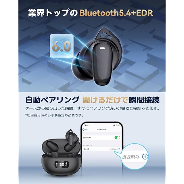 【Bluetooth 6.0+EDR 瞬時自動ペアリング & 優れた互換性】Bluetooth 5.4の遅延が低く、航続が長く、耐干渉性が高い。電池寿命・範囲を飛躍的に向上し、音飛びや途切れ、遅延、ノイズなどが最小限に抑えられ、安定した通信を実現しています。iOSやAndroid、Windows、タブレットとの互換性も向上しており。瞬時にペアリングする手順:①イヤホンを取り出す。②BLUETOOTHをオンにする。③自動ペアリング 初回ペアリング後、2回目の使用で、蓋を開けて携帯電話に自動的に接続できます。
