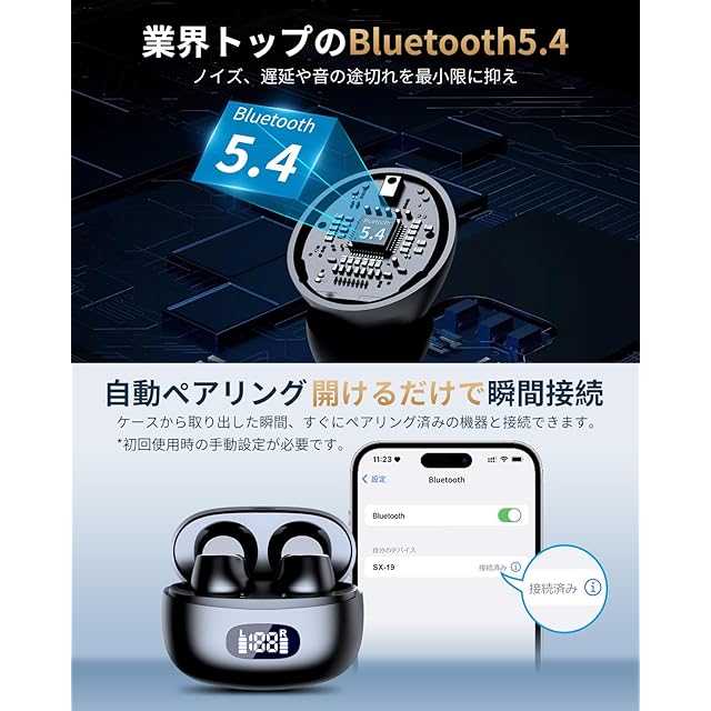 【Bluetooth 5.4+EDR 瞬時自動ペアリング & 優れた互換性】Bluetooth 5.4の遅延が低く、航続が長く、耐干渉性が高い。電池寿命・範囲を飛躍的に向上し、音飛びや途切れ、遅延、ノイズなどが最小限に抑えられ、安定した通信を実現しています。iOSやAndroid、Windows、タブレットとの互換性も向上しており。瞬時にペアリングする手順:①イヤホンを取り出す。②BLUETOOTHをオンにする。③自動ペアリング 初回ペアリング後、2回目の使用で、蓋を開けて携帯電話に自動的に接続できます。