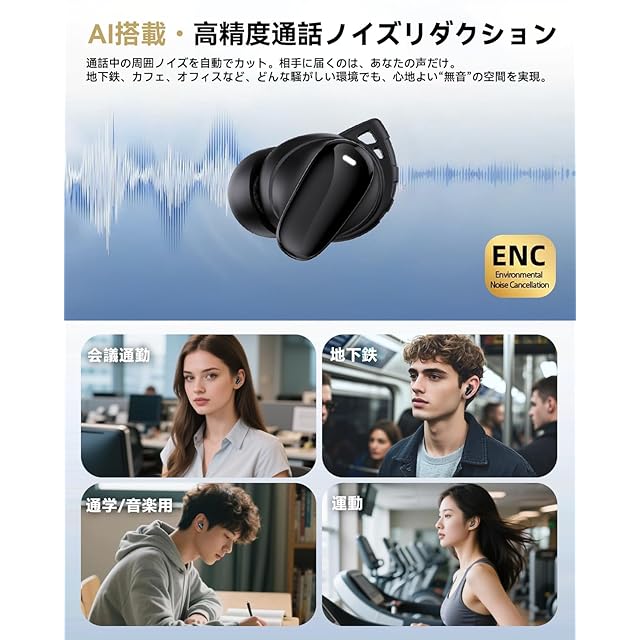 【ENC搭載 + AI通話ノイズリダクション】6つのシリコンマイク搭載 こちらのヘッドフォンは、ENC AIスマートノイズキャンセリング技術を搭載しており、周囲の騒音を正確に識別し、効果的に排除します。騒がしい街中や混雑した電車、オフィスなど、どんな環境でもクリアな通話を実現。AIによるノイズキャンセリングは、音声の出力を最適化し、自然な声で通話ができます。ビジネスでもプライベートでも、毎回の通話がスムーズに、ストレスフリーに。どんなシーンでも、クリアで効率的なコミュニケーションをお楽しみください。
