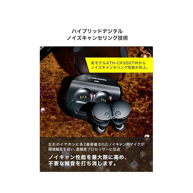 オーディオテクニカ ATH-CKS50TW2 GR(E) ワイヤレスイヤホン Bluetooth 5.3 ノイズキャンセリング 重低音 LE Audio対応 オリジナルステッカー付き マグネティックスイッチ機能 最大約65時間再生 IP55 防水防塵 マルチポイント対応 置き忘れアラート ヒアスルー 低遅延モード 急速充電 Qiワイヤレス充電対応 グリーン