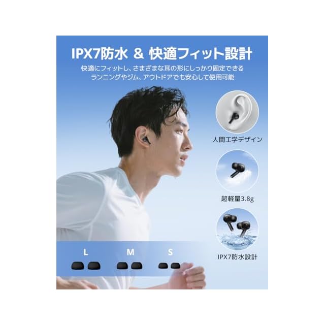 【IPX7防水・軽量フィット ワイヤレスイヤホン】IPX7防水仕様の ワイヤレスイヤホン は、雨や汗に強く、ランニング・ジム・キャンプなどのアウトドアシーンでも安心。片耳3.8gの軽量設計と人間工学に基づくフィット感で、長時間装着しても快適です。イヤホン bluetooth 接続で安定した音質を保ち、ブルートゥース イヤホン の防水性能がスポーツ中の汗や急な雨から守ります。S/M/Lイヤーチップ付きで耳にしっかりフィットし、ズレにくい仕様。高音質を保ちながら日常からスポーツまで幅広く使え、プレゼントにも最適な ワイヤレスイヤホン です。