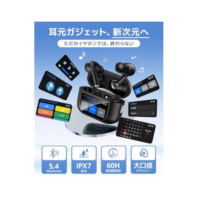 ワイヤレスイヤホン 【2025新登場・液晶で操る未来型】 イヤホン bluetooth ノイズキャンセリング ぶるーとゅーす ワイヤレス イヤフォン 通話 音質コントロール可 iphone 大口径 長時間再生 低遅延 カナル型 IPX7 防水 軽量 残量表示 gps 追跡機能 ハンズフリー 急速充電 3Way(完全遮音+通常+外部音取込) アプリ連動 EQモード 通話発信・履歴 カメラ遠隔操作
