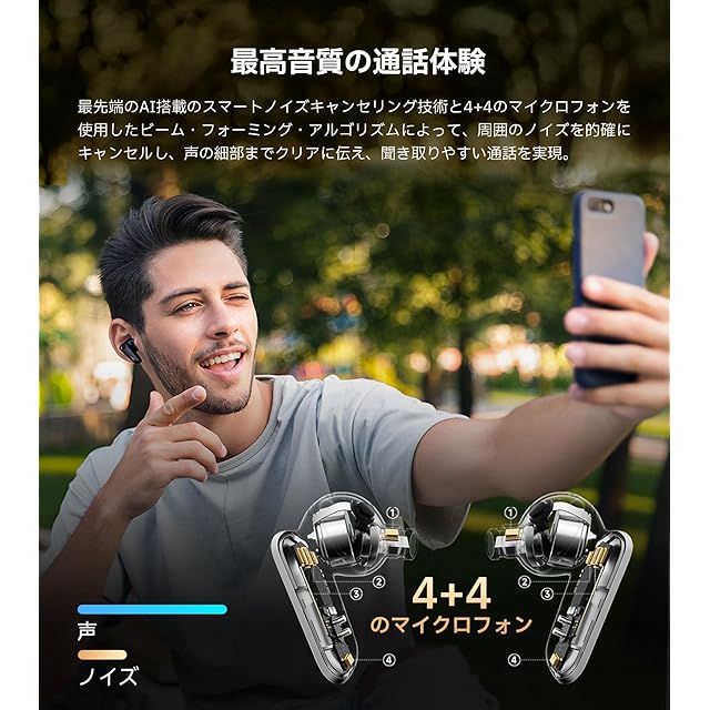 最高音質の通話体験:最先端のAI搭載のスマートノイズキャンセリング技術と4+4のマイクロフォンを使用したビーム・フォーミング・アルゴリズムによって、周囲のノイズを的確にキャンセルし、声の細部までクリアに伝える。混雑した場所でも、風の音や雑音をシャットアウト。自分の声を際立たせ、相手の声もより鮮明に聞こえ、最高の通話品質を実現。
