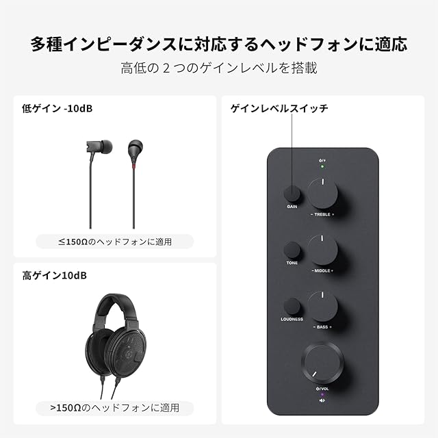 多様な機能: トーン無効化ボタンをワンクリックするだけで元のサウンドを即座に復元します。 ラウドネス機能を使用して、静かな時間に音楽に浸ってください。 ゲイン レベル スイッチを使用して、さまざまなインピーダンスのヘッドフォンに対応できるようにゲイン レベルを調整します。