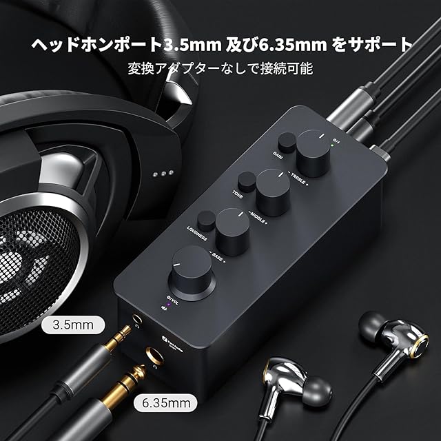 高音、中音、低音の調整機能と中心点の位置を組み合わせることで、完璧なバランスを簡単に見つけることができます。 さらに、PURE ボタンをクリックするだけで、すべてのトーン調整を簡単に無効にすることができます。 入力: 3.5mmライン入力 出力: 3.5mm ライン出力、3.5mm/6.35mm ヘッドフォンジャック 最 大出力: RMS 2400mW@32Ω 終端インピーダンス: 16-300Ω