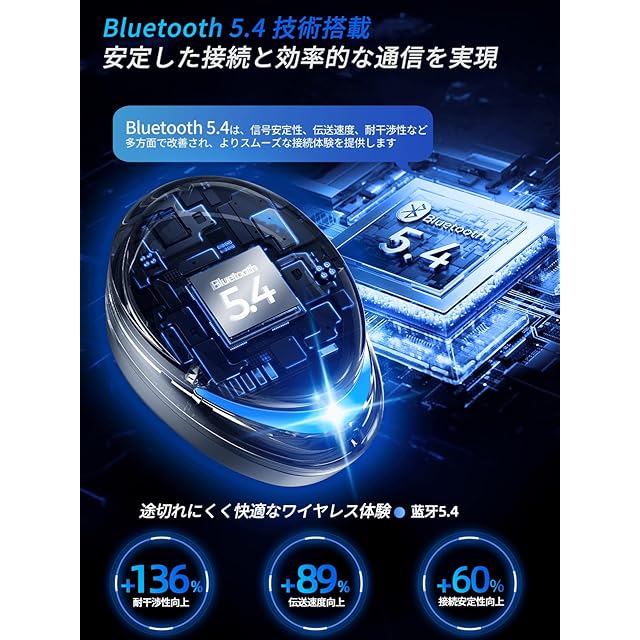 【 Bluetooth 5.4・安定かつ高速伝送】 左右イヤホンにBluetooth 5.4チップを搭載し、従来より80%向上した耐干渉性で安定した接続を実現。通信容量も2倍に拡大し、左右同時に音声信号を伝送可能。片耳・両耳モードを自由に切り替え、快適なワイヤレス体験を楽しめます。
