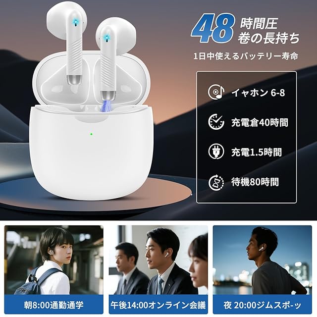 商品名:ワイヤレスイヤホン bluetoothイヤホン【2025年アップグレード版】AIスマート ENC通話ノイズキャンセリング 最新Bluetooth5.4 ブルートゥースイヤホン 全音域HI-FI音質 低遅延 接続瞬時 Type-C 急速充電 片耳/両耳 WEB会議/運動/ゲーム/テレワーク/通学/通勤/スポーツ/音楽用 iPhone/Android対応