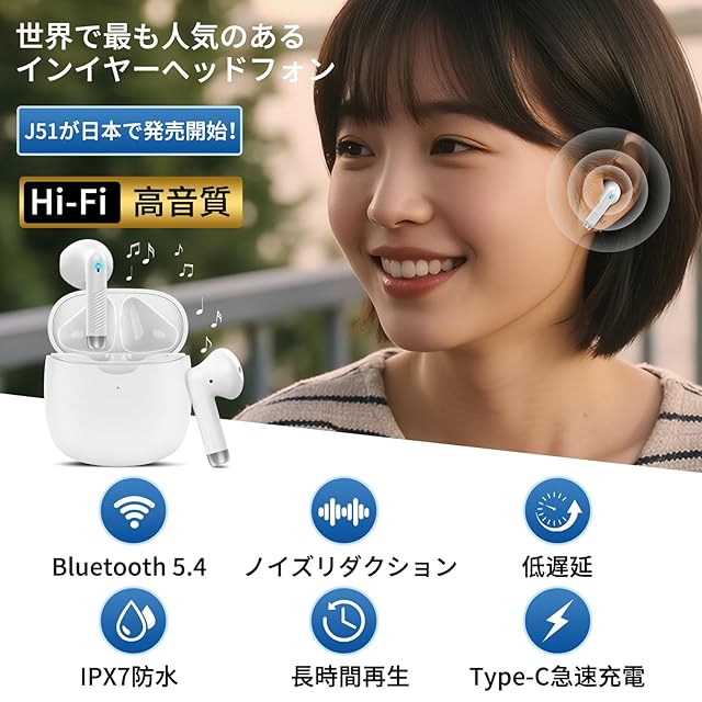 最先端Bluetooth 5.4技術で安定接続&自動ペアリング:J51 ワイヤレス イヤホンは最新のBluetooth 5.4チップを搭載し、従来のモデルに比べ接続の安定性・低遅延性能が大幅に向上。HFPプロファイルに対応し、動画やゲームでも遅延を感じにくく、スムーズな音声体験を楽しめます。さらに、イヤホン bluetooth 充電ケースの蓋を開けるだけで前回ペアリングした端末と自動的に接続。手動操作の必要がなく、スマートに音楽や通話を開始できます。