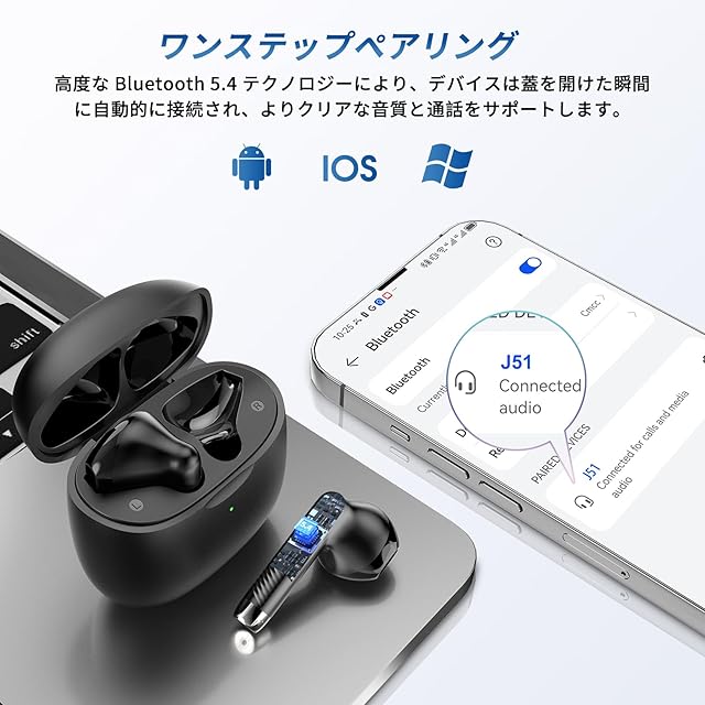最先端Bluetooth 5.4技術で安定接続&自動ペアリング:J51 ワイヤレス イヤホンは最新のBluetooth 5.4チップを搭載し、従来のモデルに比べ接続の安定性・低遅延性能が大幅に向上。HFPプロファイルに対応し、動画やゲームでも遅延を感じにくく、スムーズな音声体験を楽しめます。さらに、イヤホン bluetooth 充電ケースの蓋を開けるだけで前回ペアリングした端末と自動的に接続。手動操作の必要がなく、スマートに音楽や通話を開始できます。