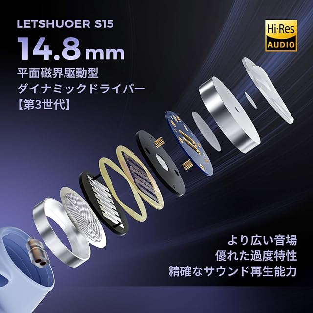 LETSHUOER「S15」は平面磁界駆動型ダイナミックドライバー(第3世代)とパッシブフィルタモジュール搭載しています。このドライバー構成により、S15はより広い音場を持っており、優れた過度特性と精確なサウンド再生能力を実現しました。LETSHUOERでは従来の平面駆動型ドライバーの構造を改良し、第3世代ドライバーとして高品質の素材と部品によって再設計し、高域と低域をスムーズに伸ばせるようにしました。LETSHUOERが独自研究開発の「R-Sonic」技術を搭載した6mmパッシブフィルタモジュールは積極的に低周波範囲を改良します。過剰な低域を抑え、内部の空気圧のバランスを取ることができます。全体的に低周波範囲の品質と音の精度を向上します。