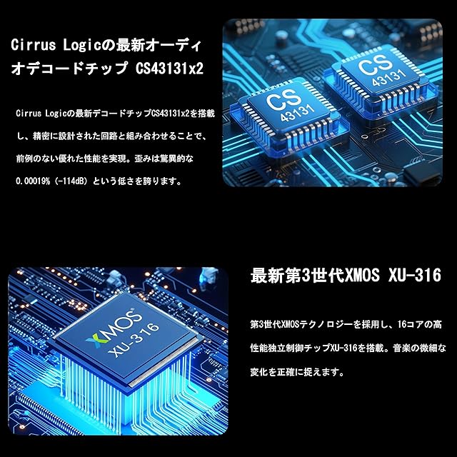 【新型第3世代XMOS XU-316】USB DACは新型第3世代XMOS XU-316を採用。新型第3世代XMOS XU-316 USBオーディオ処理チップを搭載し、16コア並列コンピューティングアーキテクチャでデジタルオーディオを再定義します。PCMは最大32bit/768kHz、DSDは最大DSD256をサポートし、レコードの温かみのある音楽性とデジタルオーディオの正確な定位感を両立しています。