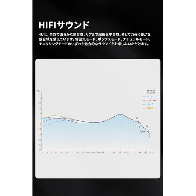 【4段階のサウンド調整】4Uは4段階調整可能なアナログフィルターを搭載しており、イヤホン背面の調整装置を回すだけで、雰囲気、Pop(ポップ)、ナチュラル、モニタリングの各モードを選択して、音をカスタマイズできます。個性に合わせたリスニング体験をお楽しみいただけます。