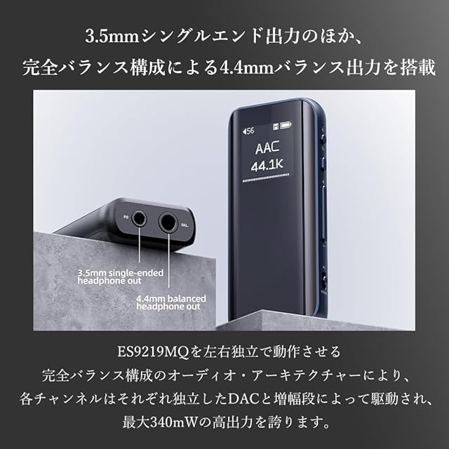 3.5mmシングルエンド出力のほか、完全バランス構成による4.4mmバランス出力を搭載:BTR15は一般的な3.5mmシングルエンド出力だけでなく、4.4mm端子によるバランス出力を備えています。 ES9219MQを左右独立で動作させる完全バランス構成のオーディオ・アーキテクチャーにより、各チャンネルはそれぞれ独立したDACと増幅段によって駆動され、最大340mWの高出力を誇ります。