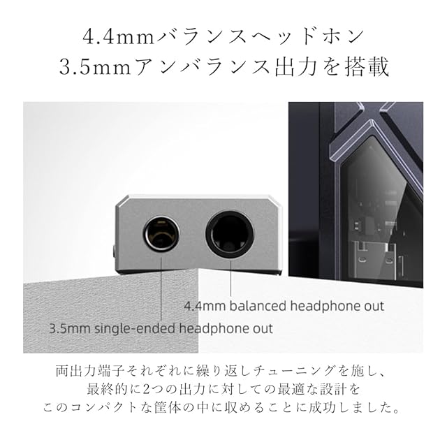 4.4mmバランスヘッドホン/3.5mmアンバランス出力を搭載:KA13には、3.5mmシングルエンドヘッドホン出力のほか、現代の高性能ヘッドホン/イヤホンで採用される4.4mmバランスヘッドホン出力も備えています。新たに搭載されたデスクトップモードによりバランスヘッドホン出力では最大550mW@32Ωの出力を発揮します。 KA13は、両出力端子それぞれに繰り返しチューニングを施し、最終的に2つの出力に対しての最適な設計をこのコンパクトな筐体の中に収めることに成功しました。