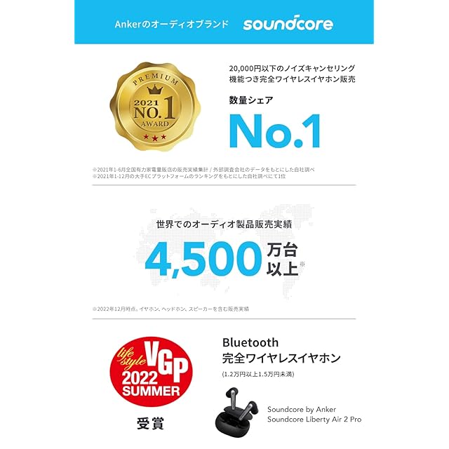 パッケージ内容:Soundcore Liberty Air 2 Pro、充電ケース、イヤーチップ(S+ / XXS / XS / S / M / M+ / L / L+ /XL ※Mサイズは本体に取り付け済み)、USB-C & USB-Aケーブル、クイックスタートガイド、安全マニュアル、カスタマーサポート ※製品パッケージは予告なく変更になる場合がございます。ご購入時期によっては異なる製品パッケージでお届けする可能性がございますので、予めご了承ください。なお、製品自体には違いはございません。 技適マーク認証済み商品(周波数帯:2402MHz~2480MHz)※ 製品パッケージ内のイヤーチップトレー及びクイックスタートガイドに記載のイヤーチップのサイズ名「XXXS、XXS、XS、S、M、M+、L、L+、XL」 は誤りです。正しくは、「S+、XXS、XS、S、M、M+、L、L+、XL+」です。