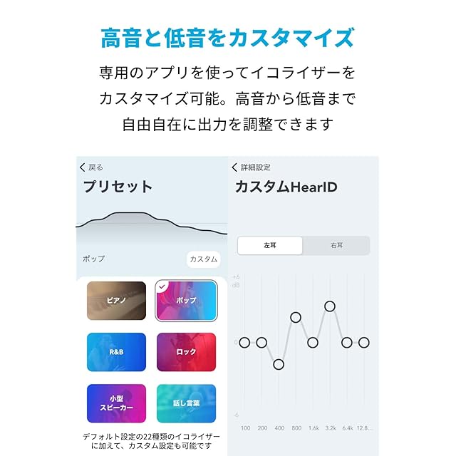 HearID 2.0:従来のHearing Profileの自動作成に加えて、ロックやポップ等の音楽ジャンルを掛け合わせて設定することが可能になり、より自分の好みにあったサウンドをお楽しみいただけます。