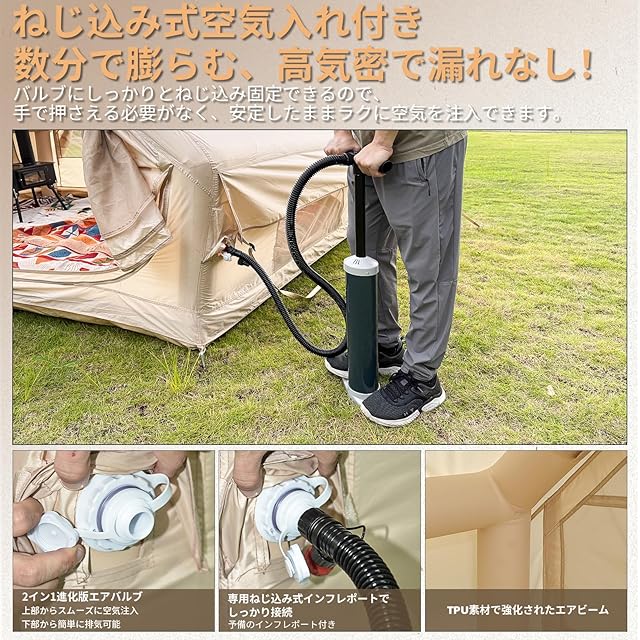 【2分で簡単設営】インフレータブルテント/エアーテントとは、空気を入れて立ち上げるテントのことです。直径約12cmの丈夫なエアフレームを採用し、しっかりとした安定感を実現。ポールを組み上げる必要がありません。高圧空気入れポンプが付属しており、軽い力で空気を入れることができます。約2分で素早く設営可能。ねじ込み式ポンプでテントのバルブにしっかり固定、空気注入中でも外れにくい設計。設営がラクラクでグループキャンプやファミリーキャンプにぴったりです。