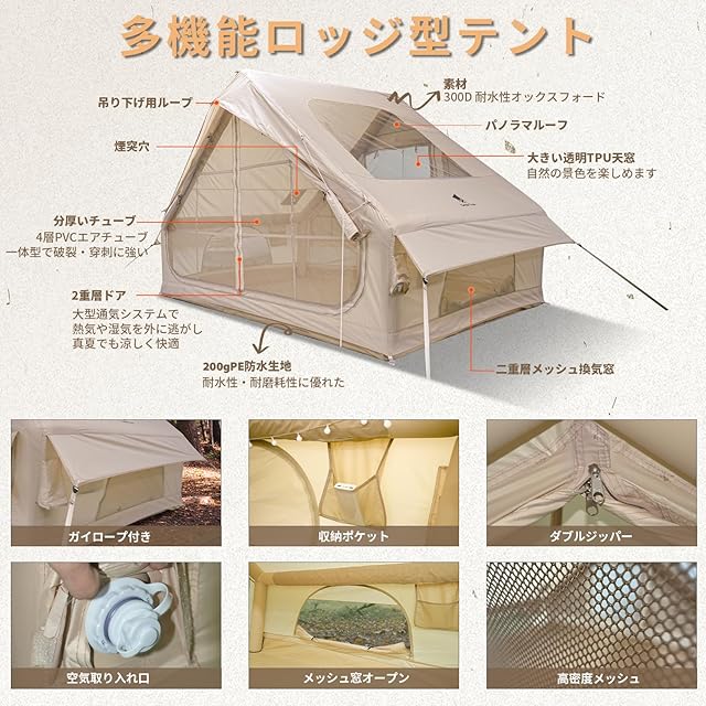 商品名:Geer Top インフレータブルテント エアーテント ロッジ型 2~6人用 大型 煙突穴付き 空気入れ付き 組立簡単 通気 4シーズン アウトドア キャンプ ファミリー用 BBQ 観戦
