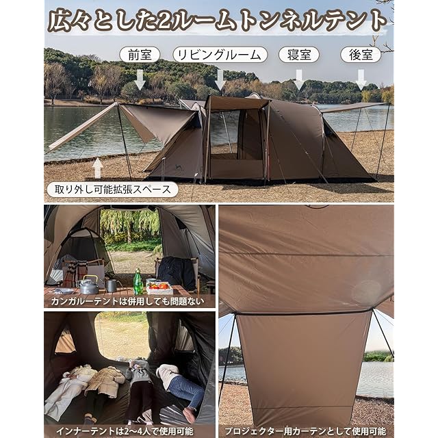 【2ルームトンネルテント】テントは広いリビングスペースと寝室を備えた2ルーム構造で、家族やグループでのキャンプに最適です。インナーテントは簡単に取り外せるため、シェルターとしても活用可能。居住空間に余裕があり、快適なキャンプライフを実現します。【テント本体のご購入にはレインフライは含まれません。ご了承ください。】