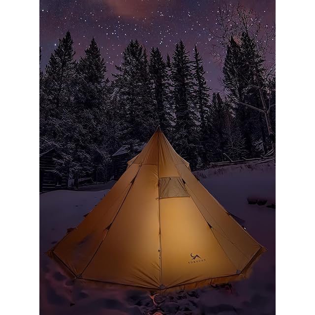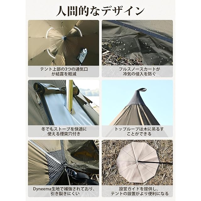 【高い居住性】テント上部の3つの換気窓が結露を軽減。 付属の煙突口により、冬でもキャンプを楽しめます。テントの中に別の小型テントを入れる「カンガルースタイル」にも最適。また、夏のキャンプではメッシュテントと組み合わせることもでき、不快な虫を防ぐことができる。