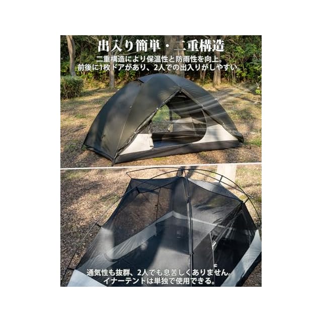 【広々快適な2人用スペース】2人用テントとして設計されたこのテントは、展開サイズが260×220×110cmで、特に、トップに追加された短いポールが頭上スペースを大幅に拡張し、2人でも楽に座れる快適な空間を実現しました。インナーテントの上部には高密度B3メッシュが採用されており、通気性抜群。レインフライには2つのベンチレーションウィンドウがあり、夜間の結露を大幅に軽減し、快適な睡眠環境を確保します。 夜間の結露を効果的に軽減します。