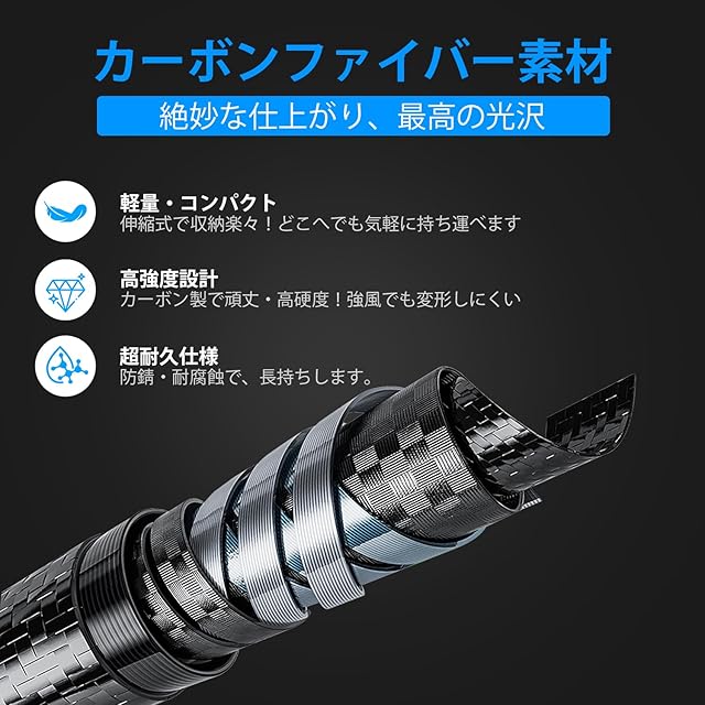 【素材のこだわり】カーボン材質を採用し、軽量かつ強度を持ています。折れにくくて、頑丈なポールです。