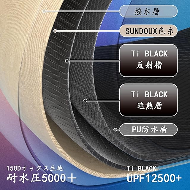 【強大な性能、どんな天気でも楽々】テント本体は150Dオックス生地を採用しており、表面には撥水層が施され、PU防水層に加え、耐水圧5000m+に達して防水性能が342kpaになり、突然の大雨にも対応が可能です。中心はTi BLACK素材を採用し、遮熱率は37%があり、99.9%の紫外線と光、赤外線が阻隔できて皮膚を保護し、UPFが12515.65に達しました!。暑い日にも、テントの中は15℃を保て。また、sundoux色糸を使用し、防引き裂き性能が強くてもっと耐久です。長く使用しても性能が減りません!キャンプ熱狂者のマストアイテムです。