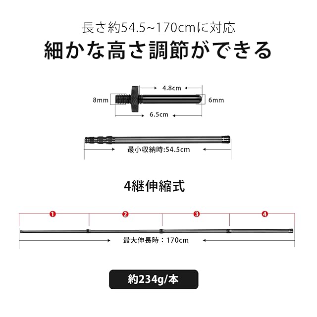 【スライド伸縮式&コンパクト】 カーボン製のスライド伸縮式テントポール!高さは無段階で54.5~170cmに簡単に調節ができます。最大直径26.5mm、収納時もコンパクト!