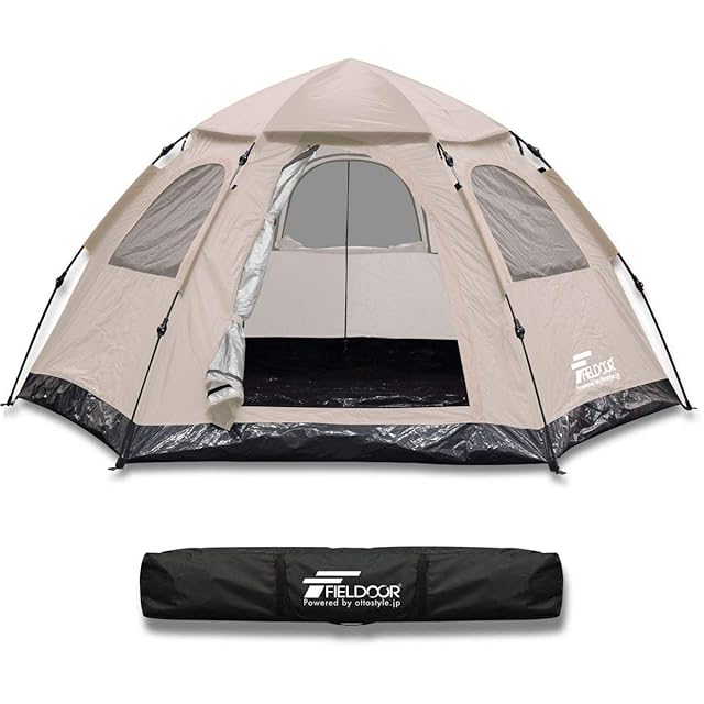 FIELDOOR ワンタッチテント 5人用ヘキサゴンタイプ 幅305cm×奥行240cm×高さ145cm 【ライトベージュ】 (紐を引くだけの簡単設営!)