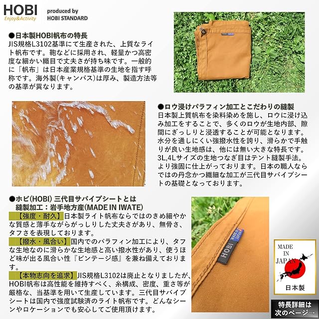 ⛺特長①日本製【MADE IN JAPAN】●JIS規格L3102基準に基づいて国内で生地生産。特殊製法により実現した上質ライト帆布とパラフィン加工された三代目サバイブシートは、高い品質を保っております。JIS規格L3102は廃止となりましたが、HOBI帆布は高性能を維持すべく、糸構成、密度、重さ等が厳格な当基準を用いて生産しております。江戸時代より使用されている頑丈で分厚くしっかりした帆布は軍用テント、救急タンカ、柔道着等に使われ、非常に破けにくい綿100%の環境にやさしい素材です。非常に軽量ながら無骨にガシガシ使用出来、薪束を包んで持ち上げてもびくともしません。特殊なパラフィン(ロウ浸け)加工により高い撥水性を実現し、使い込む程にビンテージ風な雰囲気を表現します。野外、キャンプ、ソロでの様々なシーン、ロケーションに活躍するシートです。