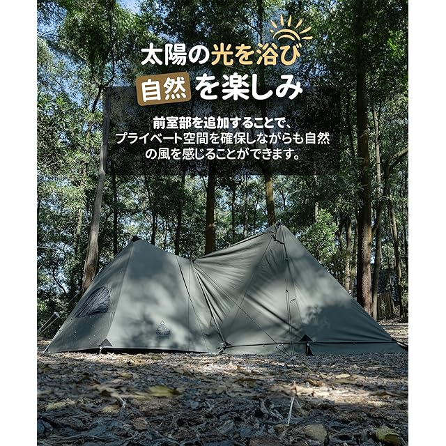 【設営簡単】前幕は三方包み込み式デザイン、ポールとガイドロープだけで 簡単にセットアップ可能、天候やシーンに合わせて自由に張ることができます。ジッパーの上部には小さなバックルを付け、テントとの連結時にできる隙間を効果的にカバーします。収納袋付きで持ち運びが便利、収納に困ることありません
