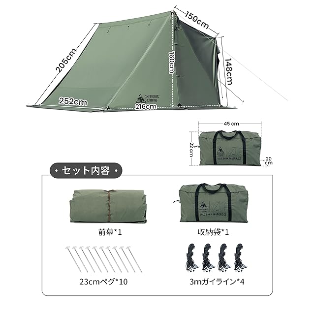 【製品仕様】素材:TCコットン、重さ:4.7 kg、展開サイズ:252CM X 216CM X160CM、収納サイズ:45CM X 20CM X22CM、耐水圧:400mm、セット内容:前幕*1、長さ3mガイロープ*4、ペグ*10、収納袋*1。商品がお手元に届きましたら、付属品が揃っていること、商品の状態が良好であることをご確認ください。何か問題がございましたら、ご注文のお問い合わせから当店のカスタマーサービススタッフまでご連絡ください