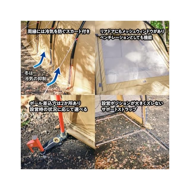 構造部材:アウターテントポール:ファイバーグラスアウターテント:ポリエステルタフタ+リップストップ210T 68D(耐水圧3000mm) インナーテント:ポリエステルタフタ185T 75D(耐水圧800mm)・フロアパーツ:ポリエステルオックスフォード(耐水圧3000mm)