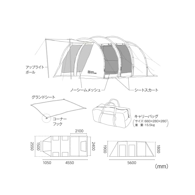 付属品:スチールペグ36本(4本予備)・ガイドロープ:2.5m×8・3.5m×2 スチールアップライトポール:2本(1750mm) グランドシート:PE(ポリエチレン) 専用キャリーバッグ(660×280×280mm)