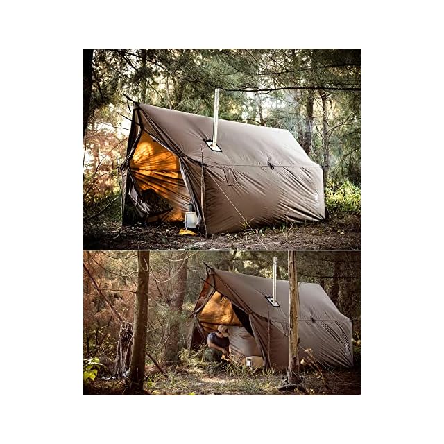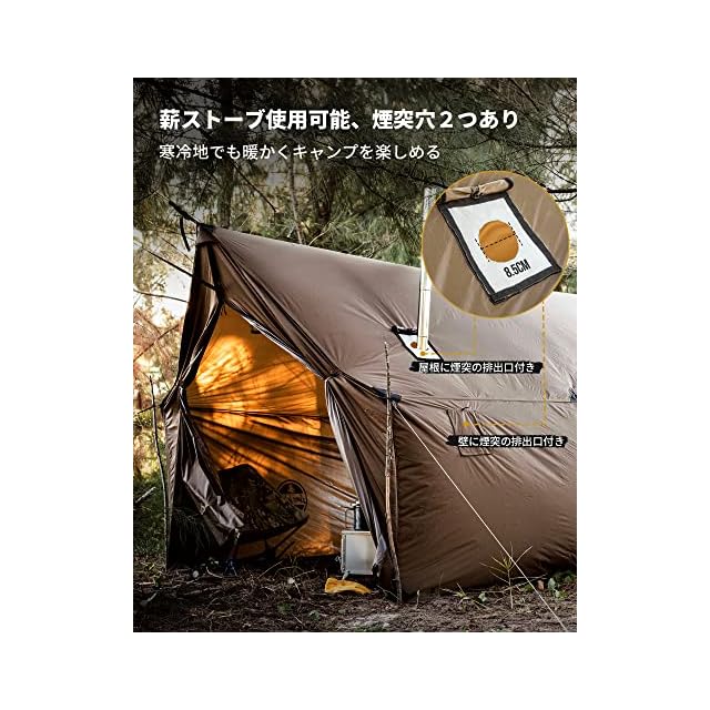 【多様なキャンプテント】テント内にハンモック設置ができ、アウトドアキャンプ中に風雨から守ることができます。 また、インナーテントだけではなく、キャンプ用コットも使用でき、装備に応じて変えることができます。 薪ストーブ使用可能、煙突穴2つあり、煙の向きを煙突で調整でき、寒冷地でも暖かくキャンプを楽しめます。スカートも付いているので寒さ対策にもなります。