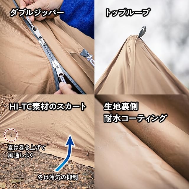 ■フライシート:Hi-TC(コットン65%・ポリエステル35%)耐水圧(2000mm)・グランドシート:PE■ポール:スチール(粉体塗装)■重量:15.0kg(付属品全て含む)