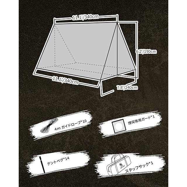 【フロアレスシェルター】この製品はキャンパーを風雨から完全に保護できるのタープです、パッケージには写真中のハンモックとテントストーブは付属していません、ご了承ください。