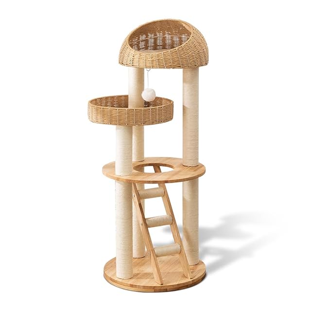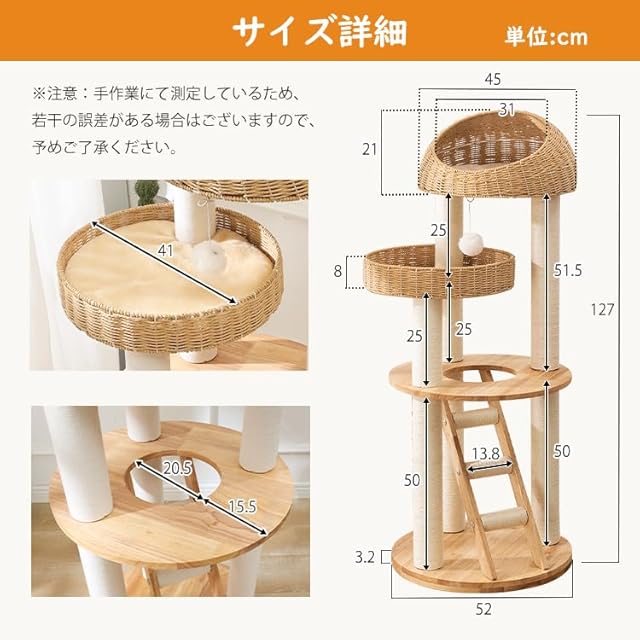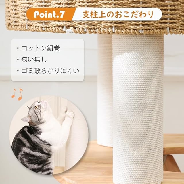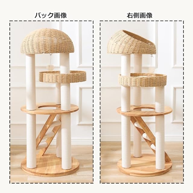 【耐久性と安定感】家具によく使用される重厚なラバーウッドを採用し、どっしりとした安定感を実現しました。猫ちゃんが勢いよく飛び降りても倒れません。手編みのカゴは内部にスチールフレームを備えているため、長年ご使用いただいても型崩れせず、安心してお使いいただけます。