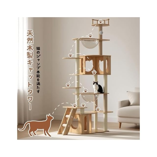 なぜ私たちのキャットタワーを選ぶのか? ペットとの快適な生活をサポートするこの多機能キャットタワーは、猫の自然な行動を考慮したデザインと実用的な機能性を兼ね備えています。衛生的な環境づくりから多頭飼い対策まで、愛猫家のあらゆるニーズにお応えします。 主な特徴: 水洗い可能な便利設計 - 宇宙船型クリアボウルは簡単に取り外し可能で、水洗いも簡単。固定ネジなし設計で衛生的な環境を維持 大型サイズで多頭飼い対応 - 幅87cm×奥行き40cm×高さ195cmの立体構造で複数匹が十分に活動可能 インテリアに馴染む高級感 - ナチュラル木目仕上げでリビングの雰囲気を損なわずおしゃれにマッチ 多機能で飽きさせない猫楽園 - 展望台・猫ハウス・爪とぎポールなど遊び要素満載 安定性抜群の安全設計 - 頑丈な四辺形土台と太い支柱で激しい動きにも対応 必須アイテムである理由: 日々のお手入れが簡単でペットの健康管理に最適 多頭飼いのストレス軽減と運動不足解消に効果的 洗練されたデザインがお部屋のコーディネートを邪魔しない 好奇心旺盛な猫が長時間遊べる仕掛けが豊富 子猫からシニア猫まで安心して利用可能な安全性 愛猫家の理想を詰め込んだこのキャットタワーは、機能美と実用性の完璧なバランスを実現。ペットとの暮らしをより豊かにする優れたアイテムです。軽量ながら高い耐久性を備え、組み立てや移動も簡単な設計で長く愛用いただけます。