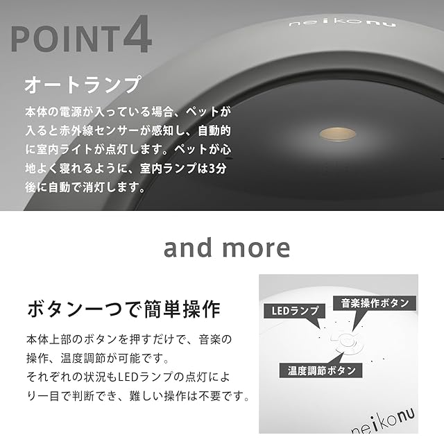 【5種類のヒーリング音楽でペットに癒しを】 ペットがくつろげるよう、5種類の音が流れる音楽機能を搭載。ゆっくり落ち着いて休める空間を演出します。 ※音楽が流れてから30分後に自動で消音します。