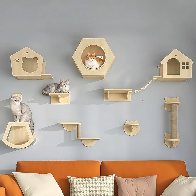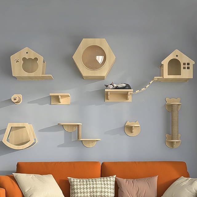 NODIBRO 猫 壁フレーム 壁掛け式猫用クライミングタワー 木製 キャットウォーク 吊り橋 DIY キャットタワー 壁掛け式 キャットウォールファニチャー&パーチ 天然素材 猫ハウス 爪とぎポール 遊び場 ストレス解消 インテリア リビング 寝室用 組み立て お手入れ簡単 日本語説明書付き