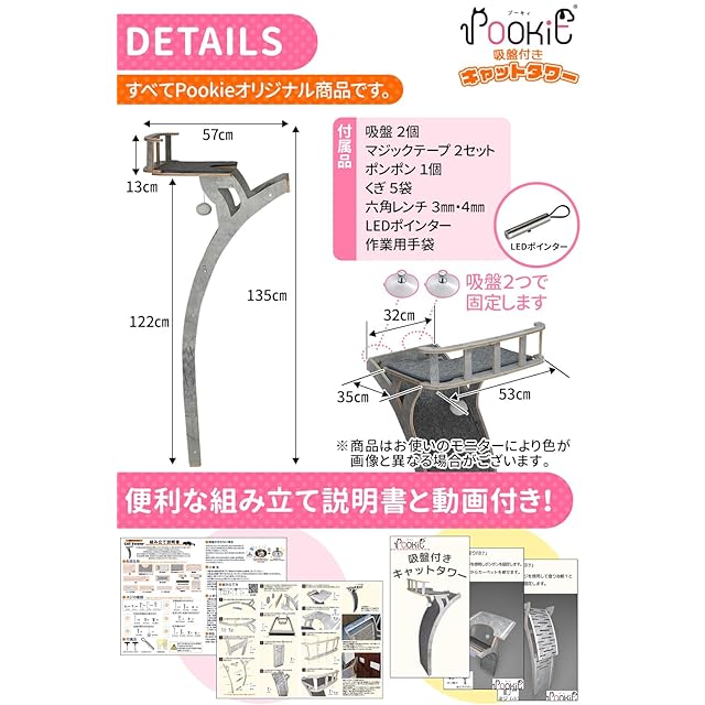 * 【 獣医師 監修の爪とぎもできる キャットタワー 】 ペット の 健康 に詳しい専門家のアドバイスを元に開発! 吸盤付きキャットタワー の ループカーペット は マジックテープ で取り外しできるため、 お手入れ も簡単。短め密度の高い ループカーペットマット は爪の引っ掛かりも良いので本能的に 爪とぎ をしたくなるでしょう。 * 【強力 吸盤 で窓ガラスにピタっ!】ツルツル面に吸い付くと、引っ張っても空気が入らない強力密着 吸盤 。猫ちゃんの活発な動きにもビクともしません。外す時は小さなツマミがあるので空気を入れながら少しずつ剥がすと取り外せます。吸盤だから 賃貸 物件でもOK!マジックテープも付属しており、 窓ガラス 以外にも取り付け可能です。 * 【省スペースで スリム なデザイン】 スリム で スマート なデザインなので場所を取りません。また、オシャレな グレー カラーでお部屋の インテリア にもよく馴染みます。 滑り台 型なので、猫ちゃんが自由に上り下りできます。 * 【 LEDライト と合わせて 運動不足解消 !】照射距離10m以上の猫ちゃんの目に優しい LEDライト を付属!キャットタワーに付いている ポンポン の 玩具 や LEDライト を追いかけて遊ぶことで猫ちゃんの運動不足を解消できます。遊び疲れたらお部屋を見渡せる柵付きの 展望台 でゆっくり休憩するのもいいでしょう。 * 【2匹乗っても抜群の安定感】キャットタワーの底には床の傷防止・ズレ防止用で 滑り止め がついており、 多頭飼い のお家での 2匹 乗りもOK!猫ちゃんの上り下りでも揺れない抜群の安定感です。 飼い主さんも猫ちゃんも安心して使用いただけます。 * 【組み立て 説明書 と 動画 付き】日本語の 取扱説明書 と 動画 が付属しており、文字説明と図解で部品明細、組み立て方法、お手入れ方法などをわかりやすく解説しています。また、滑り止め 軍手 や 六角レンチ も付属しており、開封後すぐに組み立てることが出来ます。 * 【】45日間書を付属いたしております。 不良や故障の際にはスタッフが誠心誠意対応致しますので、お気軽にお問い合わせ下さい。 迅速に返金、もしくは新品の再配送をさせて頂きます。 * 【本体サイズ】高さ約135cm×奥行き約57cm×幅約53cm【重さ】 6.3kg【素材】 木製 【カラー】 グレー