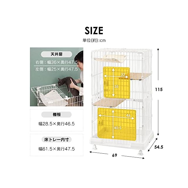 【商品説明】:コンパクトサイズで子猫にも最適なミニキャットケージです。 掃除の時やペットを取り出すのに便利な天井扉タイプです。 大きな扉でお掃除や物の出し入れがラクに行えます。 猫がゆっくりくつろげる大きめの丈夫な木製棚板が2枚付いています。 移動に便利なキャスター付きです。