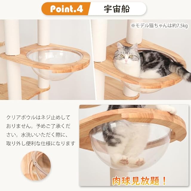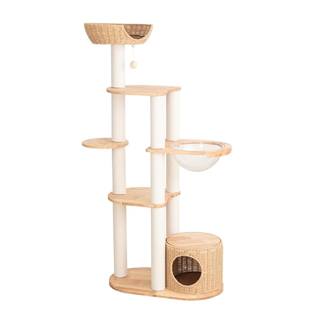 LULUCAT キャットタワー 木製 据え置き \天然木使用/ 大型猫 おしゃれ シニア猫 高さ160cm ラバーウッド 手編みカゴ インテリア性 無垢材 ラタン風 多頭飼い スリム 夏冬兼用 涼しいゴザ付 見晴台付き 猫タワー 猫ハウス 広々 登りやすい 宇宙船 クリアボウル 中型猫 成猫 子猫 爪研ぎポール ハンモック サイザル麻紐 コットン紐 ストレス発散 隠れ家 運動不足解消 安定感