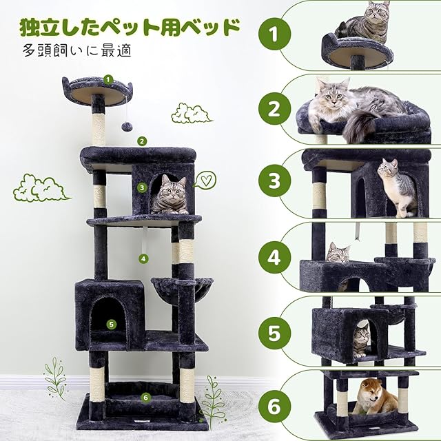 Globlazer キャットタワー ねこタワー 大型猫用 猫タワー 成猫 多頭飼い 据え置き型 登りやすい 2ねこハウス 6麻紐爪とぎポール 2つの展望台 猫 ベッド ハンモック おもちゃ 転倒防止ベルト付き 運動不足解消 安定 頑丈 高さ183cm ダークグレー S72