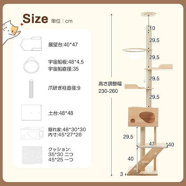 【商品仕様】サイズ:幅47×奥行き40cm×高さ230~260cm 重量(約)16.5kg。材質:天然松の木、麻縄。 わかりやすい取扱説明書も付きます。図解で部品明細、組立方法などをわかりやすく解説します。図にしたがって組み立てれば、すぐできました。★2人で組み立てることをお進めします。