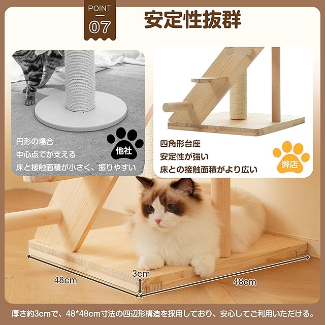 【1本で突っ張り&角に設置可能】1本の突っ張り棒で固定するので、安定性抜群です!四角型の台座を搭載すると安定性がアップされ、倒れにくいし、ぐらつきにくくたっぷり遊べます。お部屋の角に設置可能。キャットタワーが安全で信頼性のある環境を提供し、愛猫のための安定した楽しい空間を提供することで、安心感を得ることができます。角を上手に使って設置できるので、スリムで省スペースな商品です!